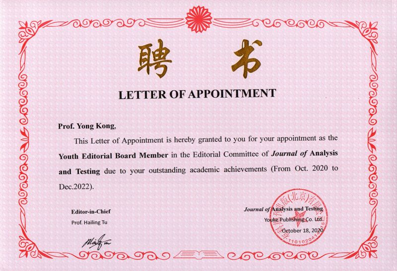 近日,pg电子官网孔泳教授入选Journal of Analysis and Testing(JAT)第一届青年编委会。JAT创刊于2017年,是“中国科技期刊国际影响力提升计划”D类项目,是国内第一本分析化学英文期刊。期刊现已被EI,Scopus,ESCI,Google Scholar,CNKI等国内外重要数据库收录。主编为屠海令院士。