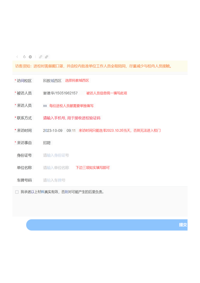 ③信息填写完毕后点击提交,审核通过后将收到预约信息登记成功短信并附带入校链接,入校时请点击链接生成入校二维码并向门卫出示即可。